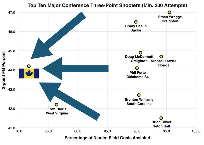 Eight of the top ten benefited from assist rates between Brady Heslip's 89.2% and Ethan Wragge's 95.5%. Eron Harris is a distinct outlier, shooting 42.4% with just 76.4% of his makes assisted.