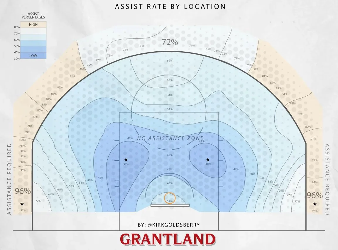 Grantland's Kirk Goldsberry covered this topic in exacting detail yesterday, posting this fascinating chart that shows the assist rate for shots made from each spot on the floor—three-pointers usually require assistance, and the rate increases as the shooter gets closer to the baseline [click to embiggen]: